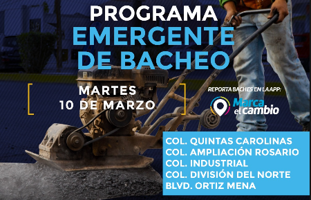 Quintas Carolinas, Ampliación Rosario, Industrial tendrán bacheo hoy 10 de marzo