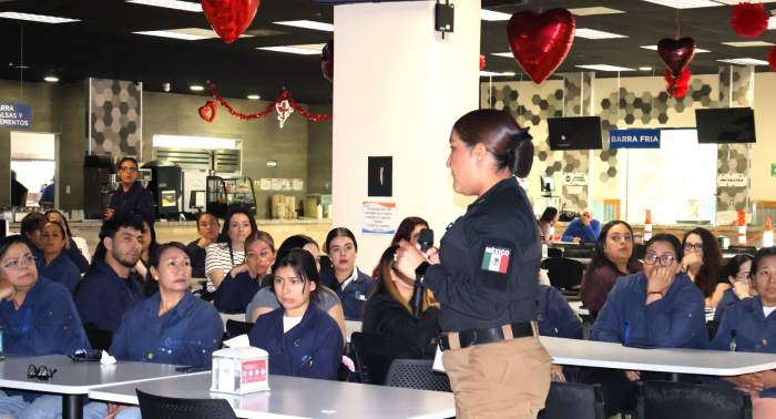 Como parte de las acciones del programa Siempre Acompañadas de la Dirección de Seguridad Pública Municipal (DSPM), imparte platicas de seguridad para las mujeres que laboran en la industria maquiladora para que tengan las...