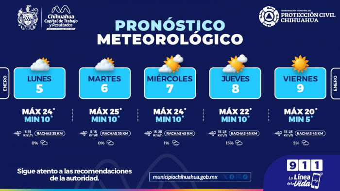 La Coordinación Municipal de Protección Civil informa que, durante la semana del lunes 5 al viernes 9 de enero, se prevén condiciones mayormente nubladas al inicio de la semana, con un descenso gradual en las temperaturas hacia...