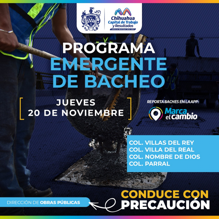 Chihuahua, Chih.- El Gobierno Municipal informó que este jueves 20 de noviembre cuadrillas de Obras Públicas realizarán bacheo emergente en las colonias Villas del Rey, Villa del Real, Nombre de Dios y...
