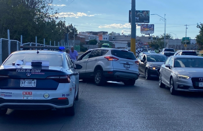 Chihuahua, Chih.- Un aparatoso percance entre dos camionetas paralizó por varios minutos la circulación en la avenida La Cantera, frente al Parque Cantera, donde por fortuna no hubo personas lesionadas.