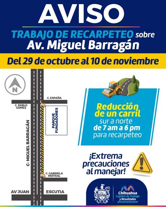 Chihuahua, Chih.- El Consejo de Urbanización Municipal (CUM) anunció que este miércoles 29 de octubre iniciarán trabajos de recarpeteo en la avenida Miguel Barragán, en el tramo...