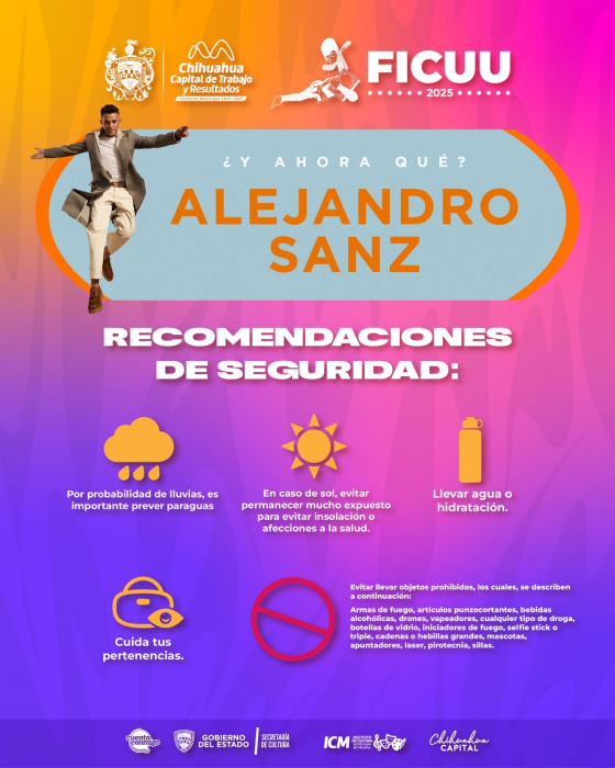 Chihuahua, Chih.- El Gobierno Municipal invita al cierre de oro del Festival Internacional de la Ciudad de Chihuahua (FICUU 2025) con el esperado concierto de Alejandro Sanz, uno de los artistas más reconocidos de la música en...