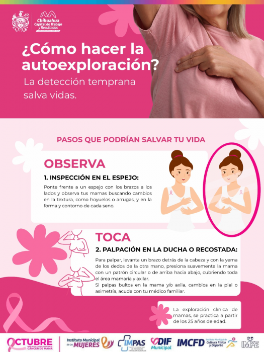 Chihuahua, Chih.- El Instituto Municipal de Pensiones, exhortó a las mujeres a realizarse la autoexploración mamaria mensual, como parte de las acciones del Mes de Sensibilización sobre el Cáncer de Mama. Esta...