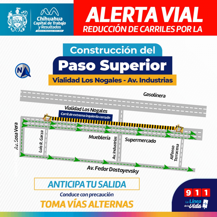 Chihuahua, Chih.- El Gobierno Municipal informó que, por trabajos previos a la construcción del Paso Superior Vialidad Los Nogales, se ha reducido de tres a dos carriles el cuerpo sur de esta importante vía, en el...