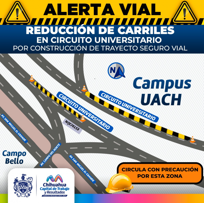 Chihauhua, Chih.- El Gobierno Municipal informó que a partir del lunes 6 de octubre se reducirá un carril más en el Circuito Universitario, frente a la Facultad de Ingeniería de la UACH, en el sentido sur-norte....