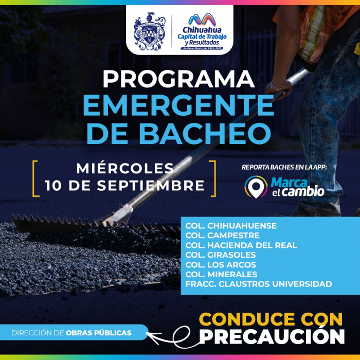 H. Ciudad de Chihuahua, Chih.- La Dirección de Obras Públicas, realizará trabajos de bacheo este 10 de septiembre, mediante el programa emergente, en las colonias Chihuahuense, Campestre, Hacienda del Real, Girasoles,...
