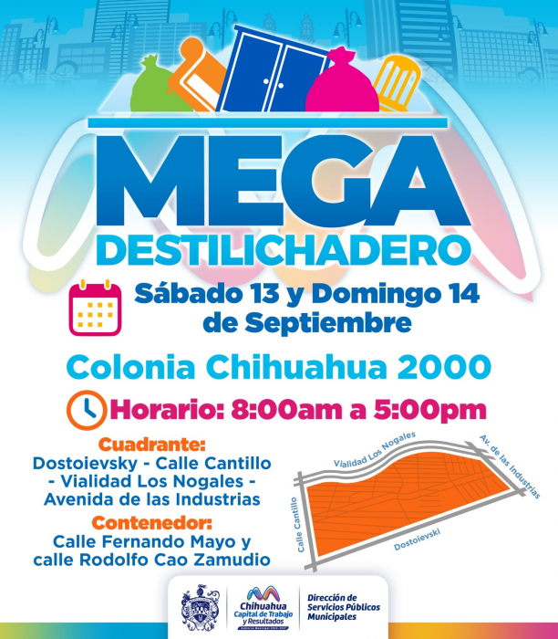 H. Ciudad de Chihuahua, Chih. A 9 de septiembre de 2025.- La Dirección de Servicios Públicos Municipales, realizará un Mega Destilichadero a la colonia Chihuahua 2000 los días sábado 13 y domingo 14 de...