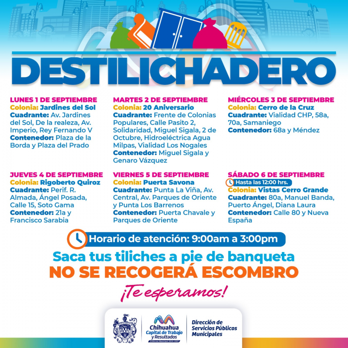 Chihuahua, Chih.- Del 1 al 6 de septiembre, el programa Destilichadero visitará seis colonias de Chihuahua, ofreciendo a la población una opción para deshacerse de basura de grandes dimensiones que los camiones...