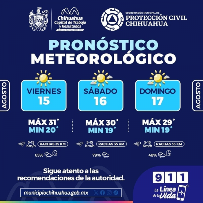 Chihuahua, Chih.- La Coordinación Municipal de Protección Civil informa que durante este fin de semana se prevén lluvias en la ciudad, por lo que se exhorta a la ciudadanía a extremar precauciones...