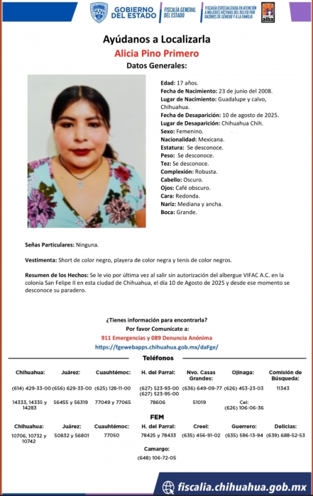 Chihuahua, Chih.- La Fiscalía General del Estado emitió una pesquisa para localizar a Alicia Pino Primero, de 17 años, vista por última vez el 10 de agosto de 2025 en la colonia San Felipe II, tras salir sin...