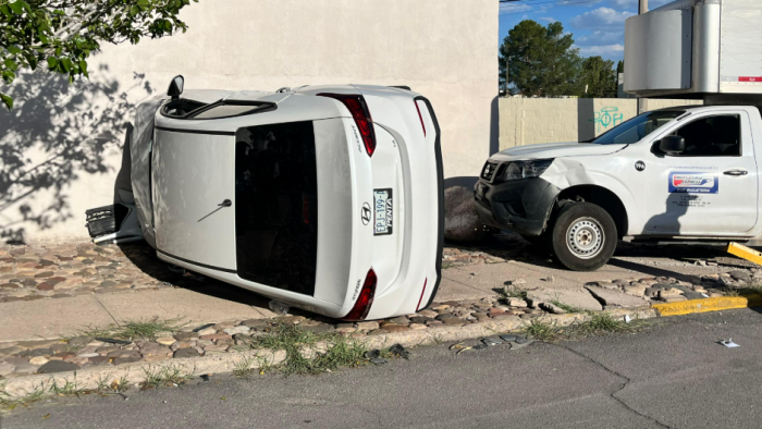 Chihuahua, Chih.- Un fuerte choque en el cruce de las calles Insurgentes y Medicina dejó un Hyundai volcado luego de ser impactado por una pickup NP300 perteneciente a una empresa.