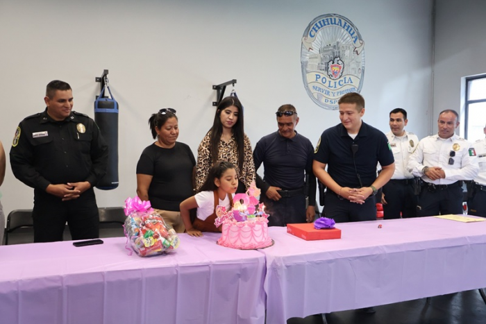 Chihuahua, Chih.- Policías del grupo de Proximidad de la Dirección de Seguridad Pública Municipal (DSPM), realizaron actividades en beneficio de una niña de 8 años de edad, quien presenta un...