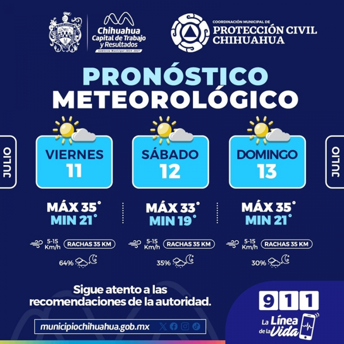 Chihuahua, Chih.- La Coordinación Municipal de Protección Civil informa que, para este fin de semana del 11 al 13 de julio, la temperatura máxima será de 35°C y la mínima rondará...
