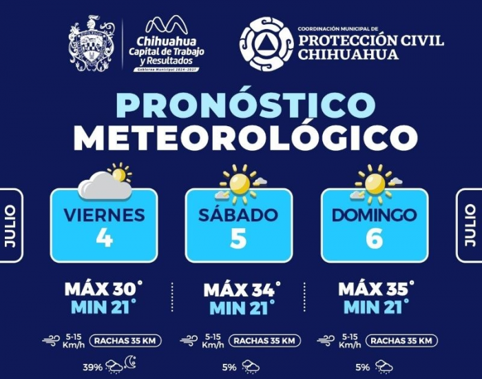 Chihuahua, Chih.- La Coordinación Municipal de Protección Civil, informa que, para este fin de semana del 4 al 6 de julio, se esperan tardes calurosas con probabilidad de lluvias por las tardes, para que las familias...