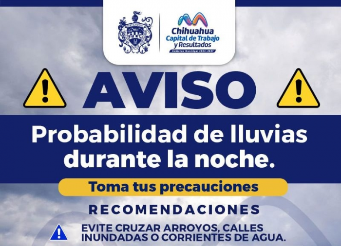 Chihuahua, Chih.- La Coordinación Municipal de Protección Civil informa que este miércoles continuarán las lluvias en gran parte de la ciudad, especialmente durante la mañana y con probabilidad de precipitaciones...