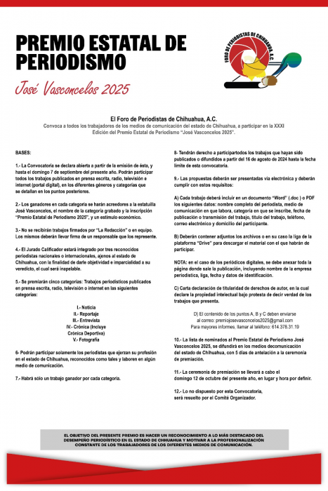 Chihuahua, Chih.- El Foro de Periodistas de Chihuahua, A.C. lanzó la convocatoria para participar en la XXXI edición del Premio Estatal de Periodismo “José Vasconcelos 2025”, dirigida a trabajadores de los...