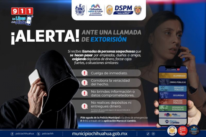 Chihuahua, Chih.- La Dirección de Seguridad Pública Municipal (DSPM) exhorta a colgar llamadas de extorsionadores y reportar a la autoridad correspondiente.