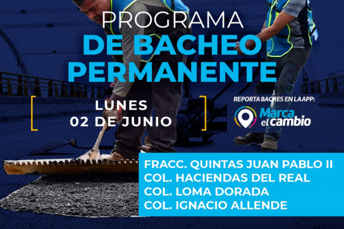 El Gobierno Municipal a través de la Dirección de Obras Públicas, realizará trabajos de bacheo el día de hoy en las colonias Haciendas del Real, Loma Dorada, Ignacio Allende y en el Fraccionamiento Quintas Juan...