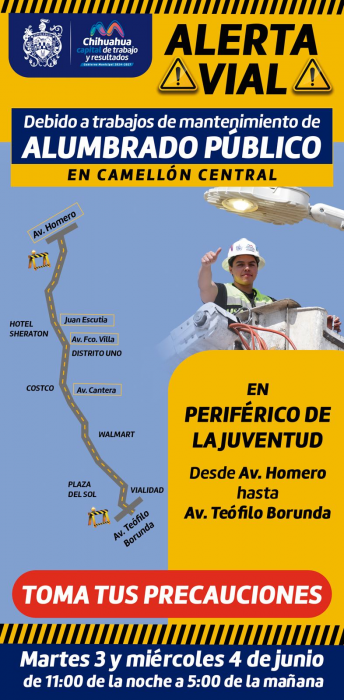 Chihuahua, Chih.- El Gobierno Municipal de Chihuahua realizará trabajos de mantenimiento al sistema de alumbrado público en el Periférico de la Juventud los días martes 3 y miércoles 4 de junio, en...