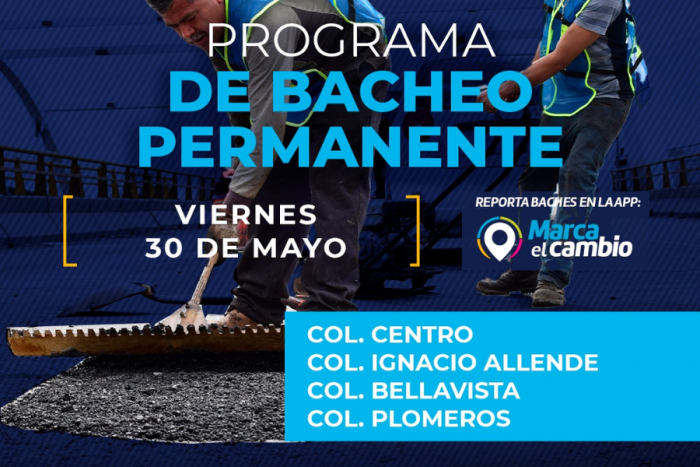 El Gobierno Municipal, por medio de la Dirección de Obras Públicas, informa que este viernes se tendrán labores de bacheo en las colonias Centro, Ignacio Allende, Bellavista y Plomeros.