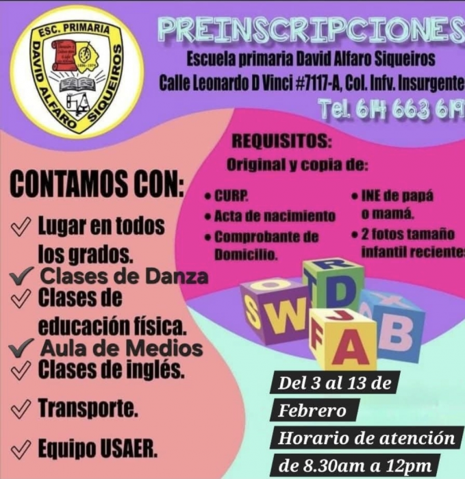 Chihuahua, Chih - Con clases de inglés, actividades en aula de medios y atención mediante equipo USAER, la Escuela Primaria David Alfaro Siqueiros mantiene abierto su proceso de preinscripción correspondiente al ciclo...