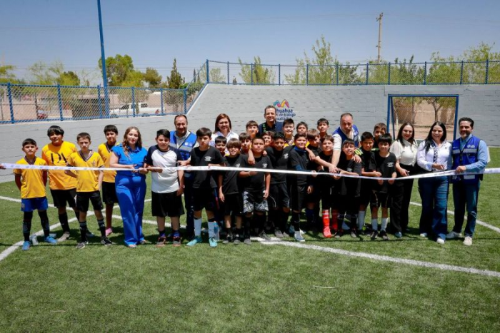 Chihuahua, Chih.- El alcalde Marco Bonilla entregó esta mañana a la comunidad estudiantil de la Escuela Primaria “20 Aniversario”, de la cancha de futbol...