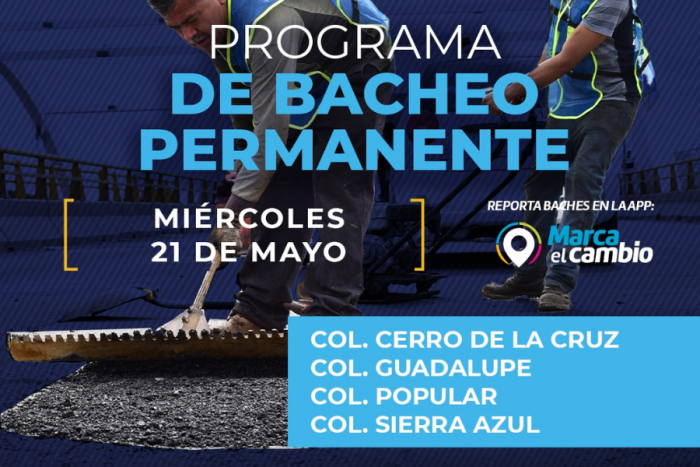 El Gobierno Municipal, por medio de la Dirección de Obras Públicas, informa que este miércoles se tendrán labores de bacheo en las colonias Cerro de la Cruz, Guadalupe, Popular y Sierra Azul.
