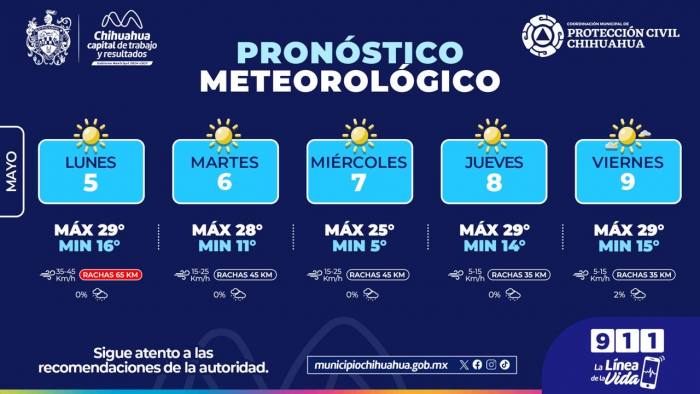 La Coordinación de Protección Civil Municipal informa que para esta semana se pronostican temperaturas máximas de 29°C con mínimas de 11°C, así como vientos con rachas de hasta 65 km por hora...
