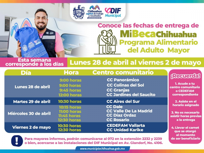 Chihuahua, Chih.- El DIF Municipal informa a las y los solicitantes del Programa Alimentario del Adulto Mayor (PAAM) los centros comunitarios y horarios en los que podrán acudir por su paquete alimentario del 28 de abril al 2 de...