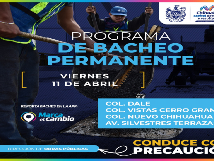 Para mantener las calles de la capital en óptimas condiciones, el Gobierno Municipal a través de la Dirección de Obras Públicas, bacheará este 11 de abril calles de las colonias Dale, Vistas Cerro Grande, Nuevo...