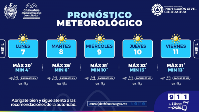 Chihuahua, Chih.- La Coordinación de Protección Civil Municipal informa que para esta semana se pronostican temperaturas máximas de 32°C con mínimas de 6°C, por lo que se exhorta a la población a no...