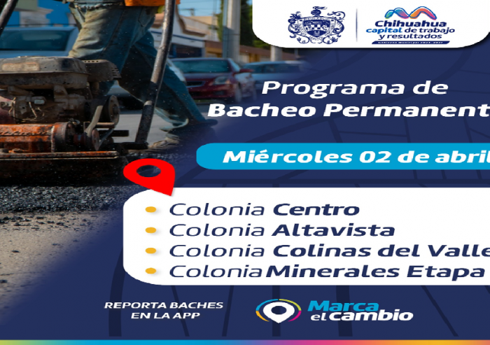Chihuahua, Chih.- Para mantener las calles de la capital en óptimas condiciones, el Gobierno Municipal a través de la Dirección de Obras Públicas, realizarán trabajos de bacheo el día de hoy en las colonias...