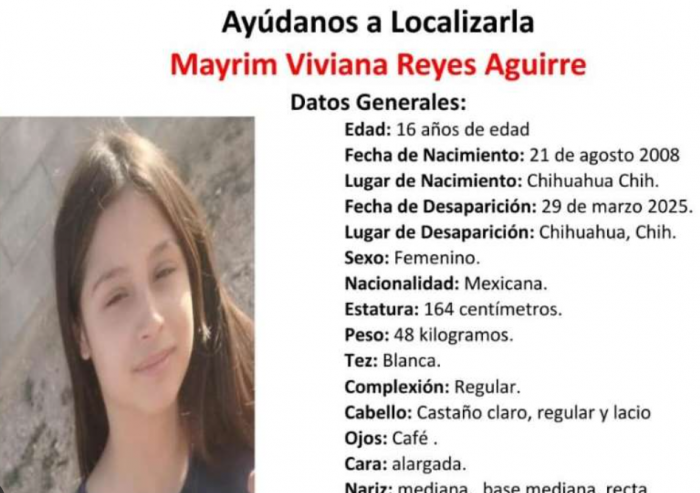 Chihuahua, Chih.- La joven Mayrim Viviana Reyes Aguirre, de 16 años, fue reportada como desaparecida el 29 de marzo en la ciudad de Chihuahua.