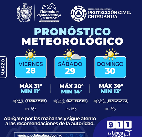 Chihuahua, Chih.- La Coordinación Municipal de Protección Civil, informa que este fin de semana, del 28 al 30 de marzo, se prevén temperaturas máximas de 31°C y mínimas de 11°C....