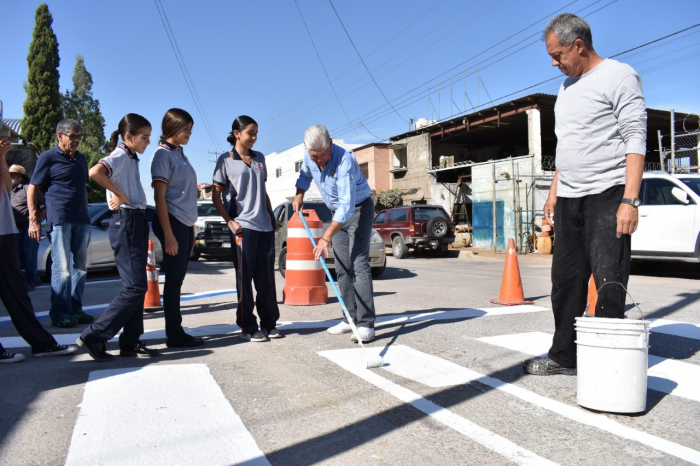 Chihuahua, Chih.- El diputado Mario Rodríguez del Partido Acción Nacional (PAN), acudió este lunes a la Secundaria Estatal Pedro Zuloaga 3006 de la colonia Tiradores, para pintar los pasos peatonales cercanos a la misma, en...