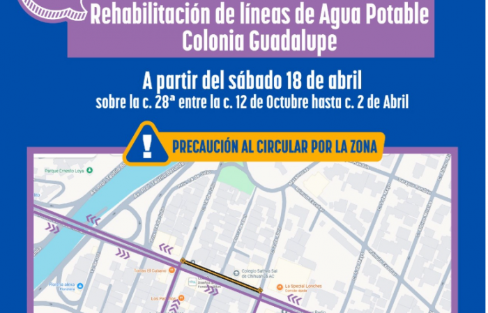 La Junta Municipal de Agua y Saneamiento (JMAS) de Chihuahua informa que este 18 de abril iniciará la rehabilitación de la línea de agua potable en la calle 28, entre 14 de Julio y 2 de Abril, en la colonia Guadalupe.