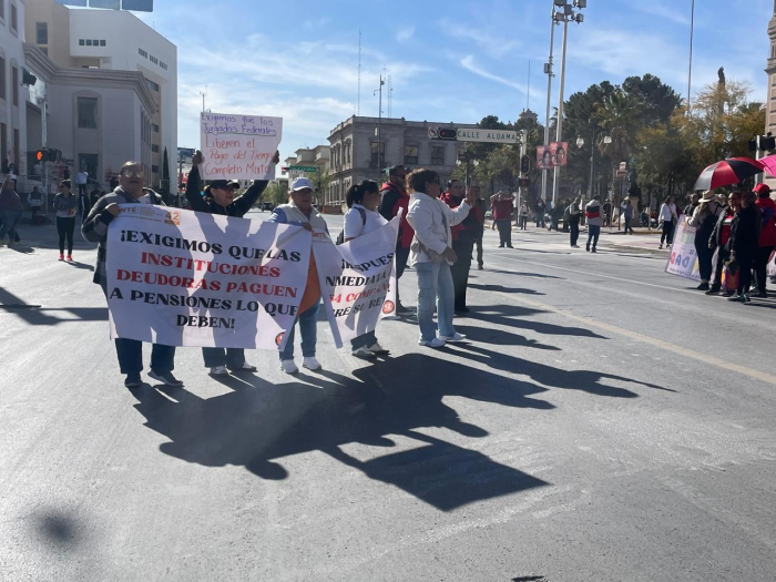 CHIHUAHUA, Chih.- Derecho habientes de Pensiones Civiles del Estado se manifestaron la mañana de este jueves en el edificio Héroes de Reforma, en dónde se ubica la Secretaría de Hacienda.