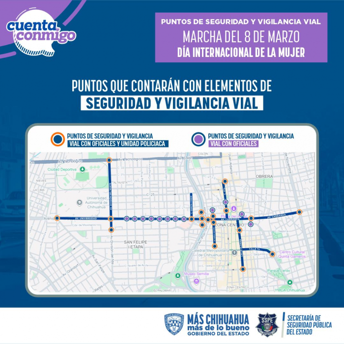 CHIHUAHUA, Chih.- Como parte de la estratgeia para garantizar la seguridad de manifestantes y población en general, la Secretaria de Seguridad Publica dio a conocer los puntos estratégicos en los que estarán ubicados los...