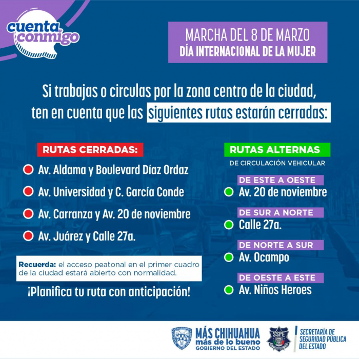 CHIHUAHUA, Chih., 06 de marzo de 2025.-La secretaria de Seguridad Publica, informó esta mañana de jueves las vialidades y calles que se encontraran cerradas, por la colocación de vallas de protección en el primer cuadro...