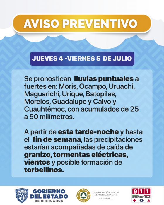 Chihuahua, Chih.- La Coordinación Estatal de Protección Civil (CEPC), emitió un llamado a la población para que tome las medidas de precaución necesarias, ante la alerta preventiva por lluvias que persiste en...