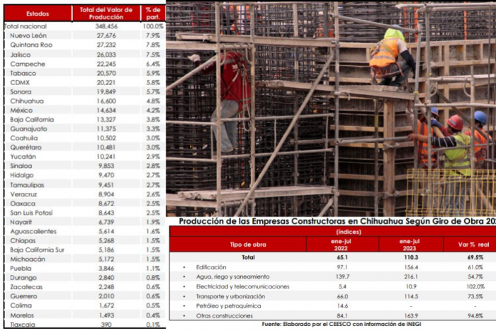 Chihuahua, Chih.- Las empresas constructoras del estado de Chihuahua, registraron un valor de producción acumulado de 16 mil 600 millones de pesos corrientes, durante el periodo enero-julio de 2023, según reporte del...