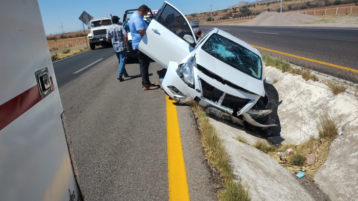 Chihuahua, Chih.- Durante la tarde de hoy se registró un considerable accidente vehicular en la carretera de Chihuahua a Cuauhtémoc donde el conductor de un Nissan, Versa perdió el control de la unidad.Los hechos se registraron cuando el tripulante de un auto tipo sedan de color blanco terminó por caer en la división de la carretera al parecer por exceso de velocidad, dejando tras su paso lesiones de consideración.