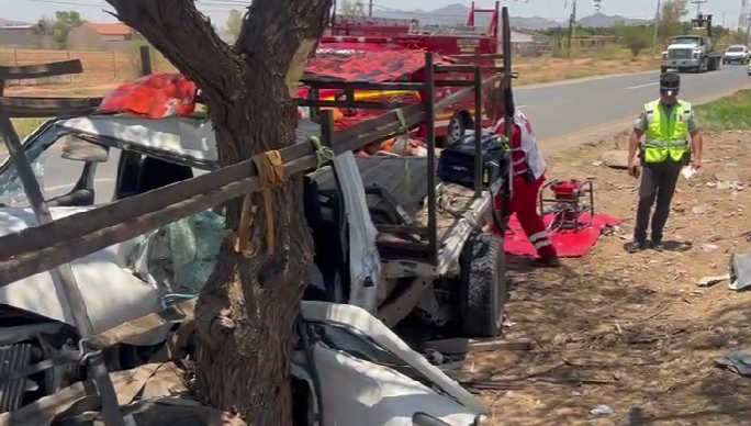 Quedan atrapados en su pick up tras impactarse vs árbol en la rúa Aldama - Chih