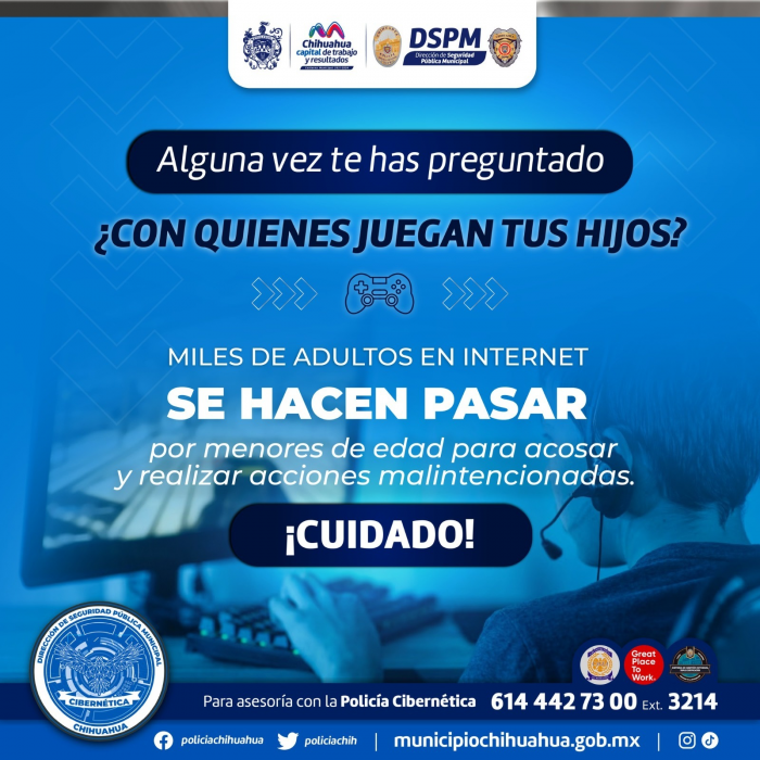 Chihuahua, Chih.- El Gobierno Municipal a través de su Policía Cibernética, exhorta a los padres de familia y encargados de su cuidado a estar pendientes de las personas con la que sus hijos interactúan en internet, para evitar que sean víctimas de delitos de índole sexual o extorsiones.