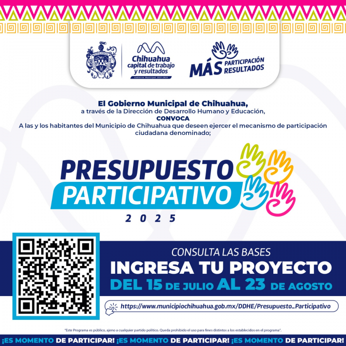Chihuahua, Chih.- El Gobierno Municipal, a través de la Dirección de Desarrollo Humano y Educación, invita a participar en la primera fase del Presupuesto Participativo 2025 con foros informativos y la recepción de propuestas, que inician hoy a las 6:00 de tarde.