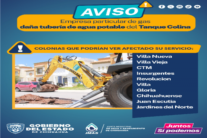 La Junta Municipal de Agua y Saneamiento (JMAS) Chihuahua, dio a conocer que realizan las labores correspondientes para reparar la tubería de bajada del tanque Colina, luego de que una empresa particular al servicio de Ecogas generó daños en su infraestructura.La dependencia indicó que la compañía privada ocasionó averías en el tubo de 12 pulgadas de diámetro cuando realizaba maniobras de trabajo a la altura de la calle Vicente Güereca y avenida Tecnológico, el pasado martes cerca de las 11:30 pm.