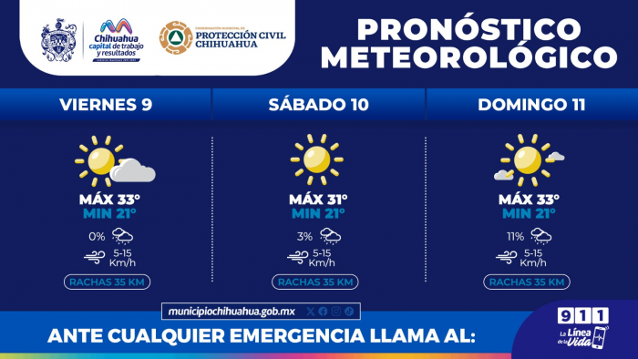 Chihuahua, Chih.- La Coordinación Municipal de Protección Civil, informa que este fin de semana, del 9 al 11 de agosto, se prevén temperaturas máximas de 33°C y mínimas de 21°C.