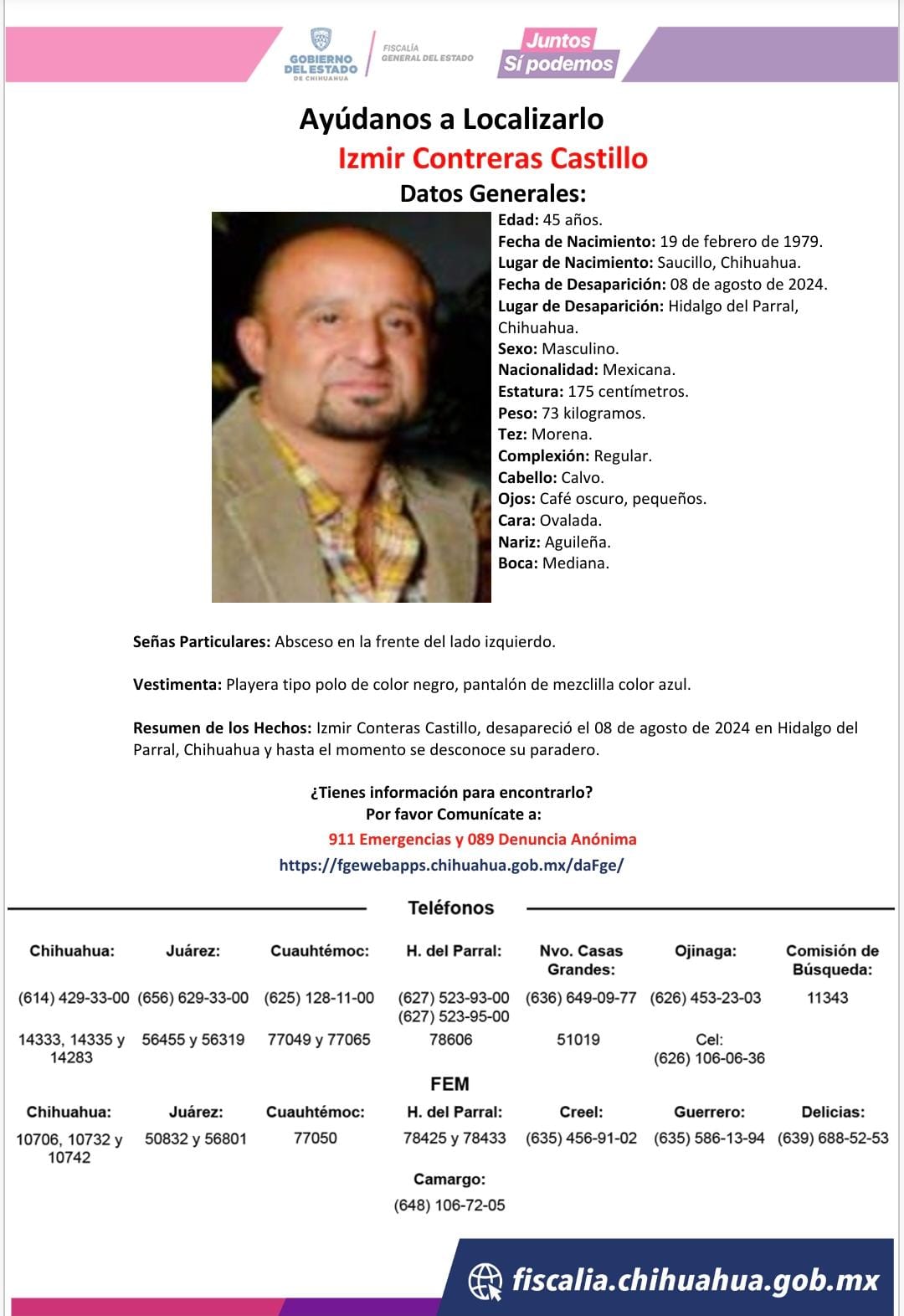 Izmir Contreras Castillo tiene 45 años de edad y es originario del municipio de Saucillo, la última vez que se supo de él fue el pasado 08 de agosto en la ciudad de Parral.