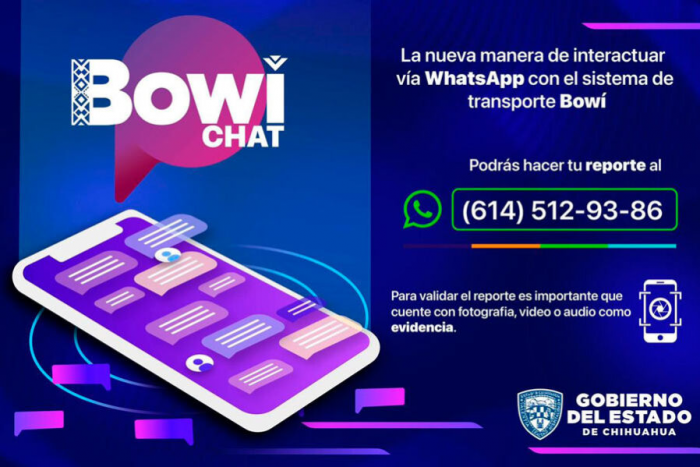 Chihuahua, Chih.- La Secretaría General de Gobierno, a través de la Operadora de Transporte (OTV), habilitó un chat en WhatsApp para que las y los usuarios puedan realizar reportes de quejas y/o incidencias relacionadas con el sistema de transporte Bowí.